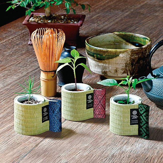 白磁のおちょこを和紙畳のスリーブで巻いた栽培キット。畳と畳縁(たたみべり)の質感は、本格的な和室の雰囲気そのもの。おちょこで縁起の良い和の植物を育てます。